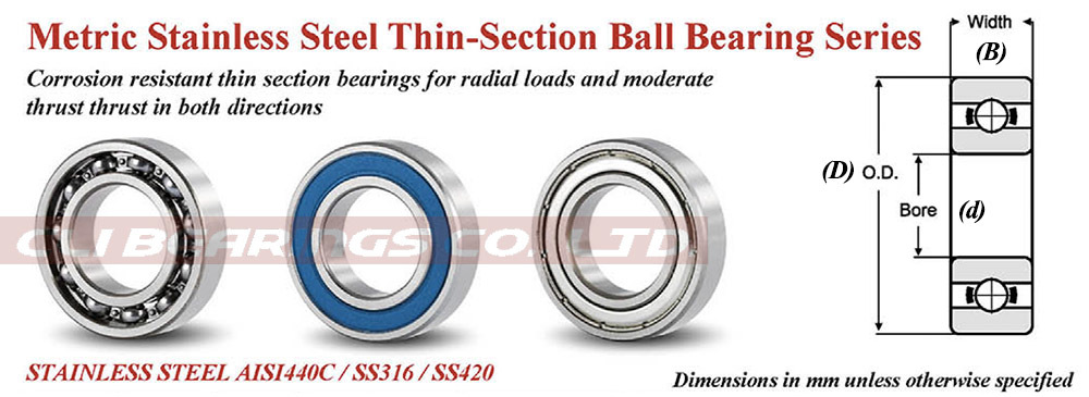AISI440C Stainless Steel, Thin-Section Ball Bearings for shaft sizes from 3 mm to 80 mm |