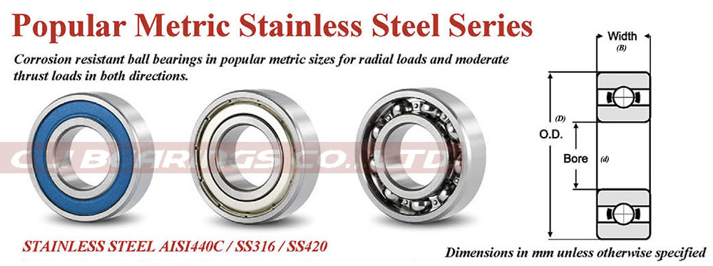 These stainless steel bearings are manufactured in AISI-440C. The stainless steel shields and retainers are usually made from AISI-304 stainless steel but some sizes are available with a reinforced polyamide retainer. All sizes can be supplied with stainless steel shields or rubber contact seals.