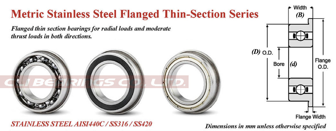 AISI440C STAINLESS STEEL, Thin-Section Ball Bearings SF67 / SF68 / SF69 FLANGED, METRIC sizes |