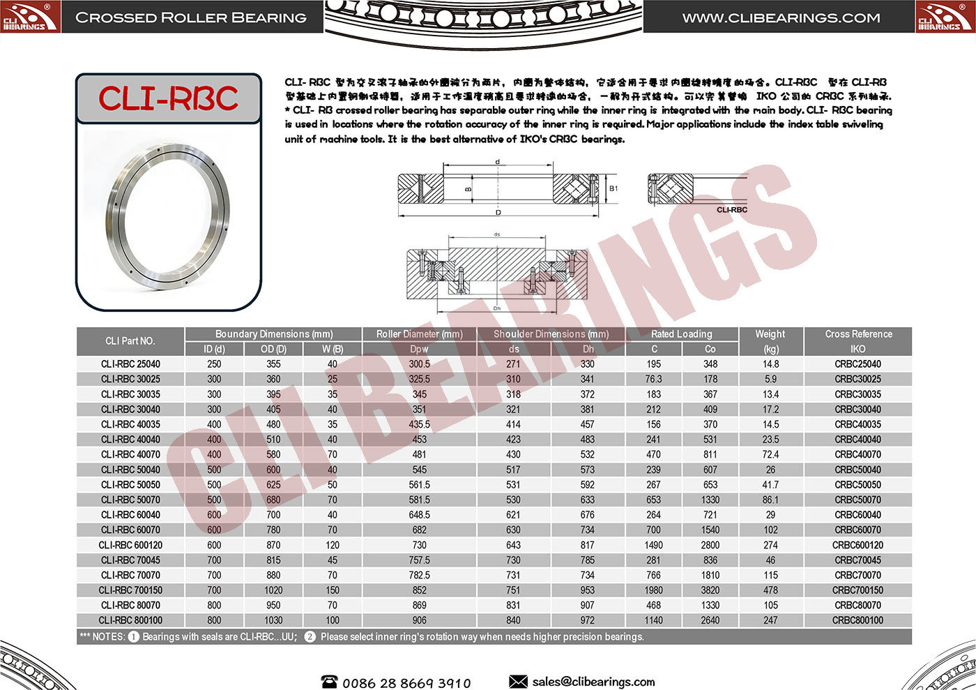 CLI- RB crossed roller bearing has separable outer ring while the inner ring is integrated with the main body. CLI- RBC bearing is used in locations where the rotation accuracy of the inner ring is required. Major applications include the index table swiveling unit of machine tools. It is the best alternative of IKO's CRBC bearings. |