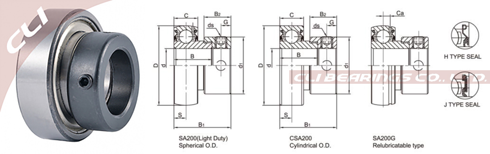 SA2 and CSA2 type ball bearing is sealed on both sides with newly developed J and H type seals and it has an accentric locking collar on the outside of the inner ring. It can be used for assembling use with any type of the housing for light duty.