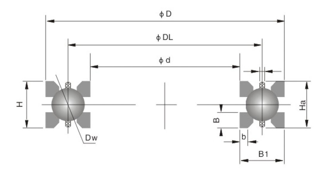 | DL | mm | inch | b | B | d | D | H | B1 | Ha | Hb |